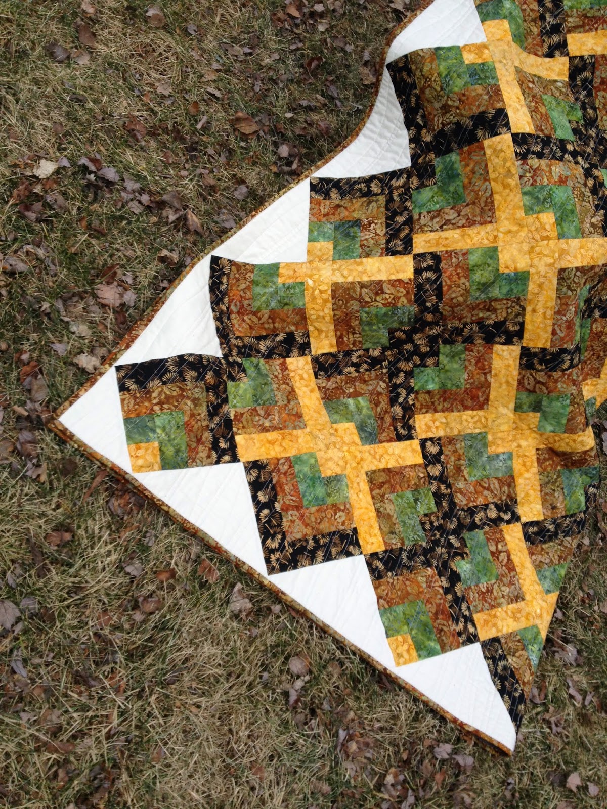 8. Binding - This is the easy part. As my Mother would say - the elephant has passed, just the tail remains. I used strips from the brown batik fabric for binding. It took 10 strips. Stitched to the back of the quilt, brought it to the front and stitched it using my favorite squiggly stitch.