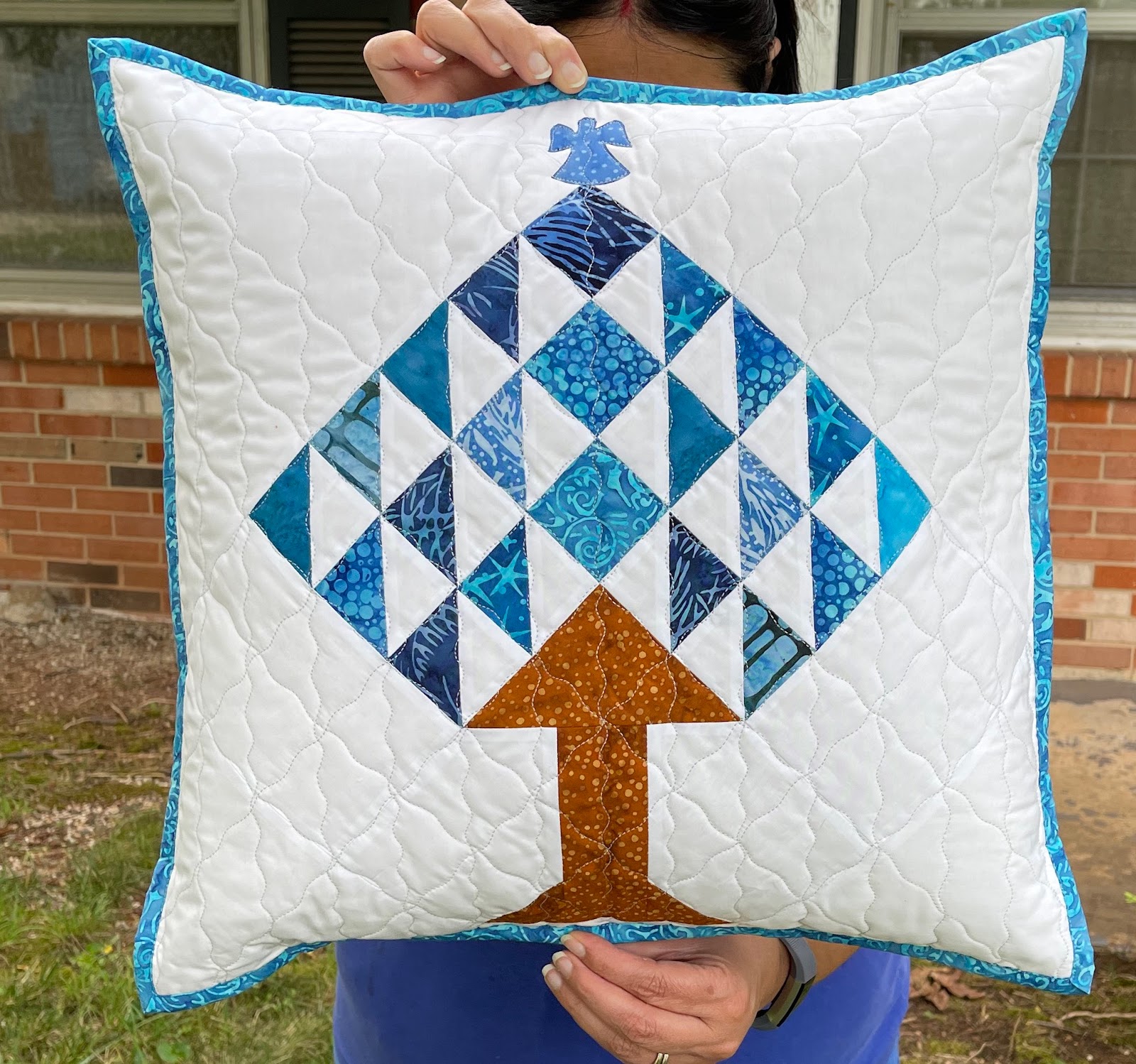 And then it came to me. I remembered that the Winter Sky collection had an angel print fabric. In Blue!!! Perfect!!! I rough cut the angel shape and ironed it to the sticky side of a stabilizer. Cut it carefully using a pair of sharp scissors, removed the paper, placed it on top of the tree and ironed it in place. Stitched around the edges to secure it.