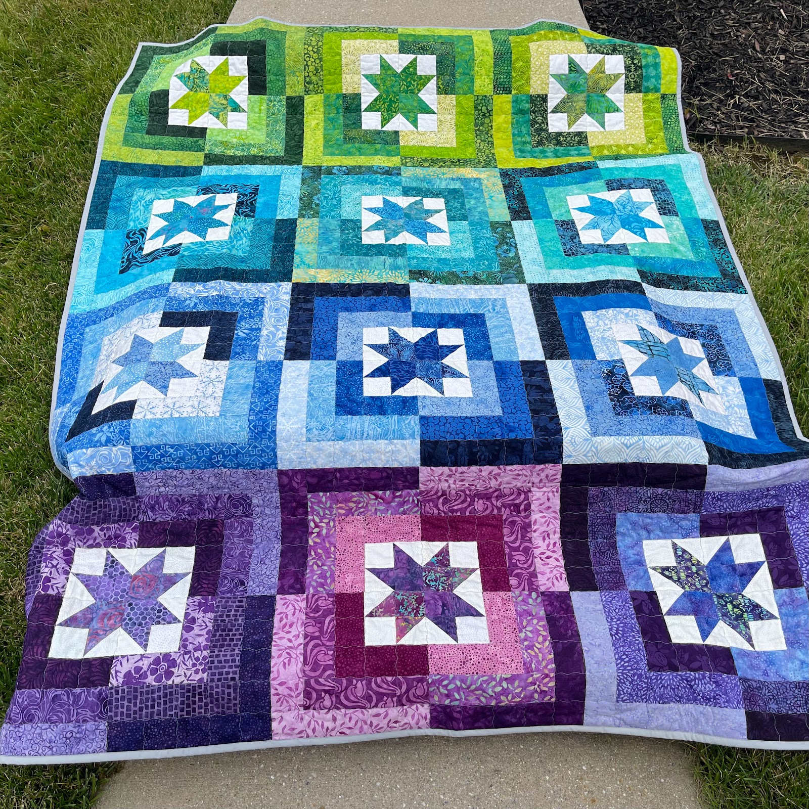 Let's meet Avantika Cool. Made using blue, green, turquoise and purple, she finished at 60" by 80".