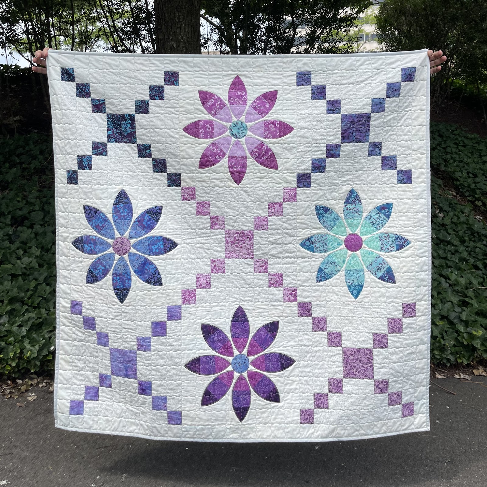 Designed in EQ8, and made with Poetic Bouquet collection, it is a combination of Irish Chain blocks and appliqued Daisy blocks.