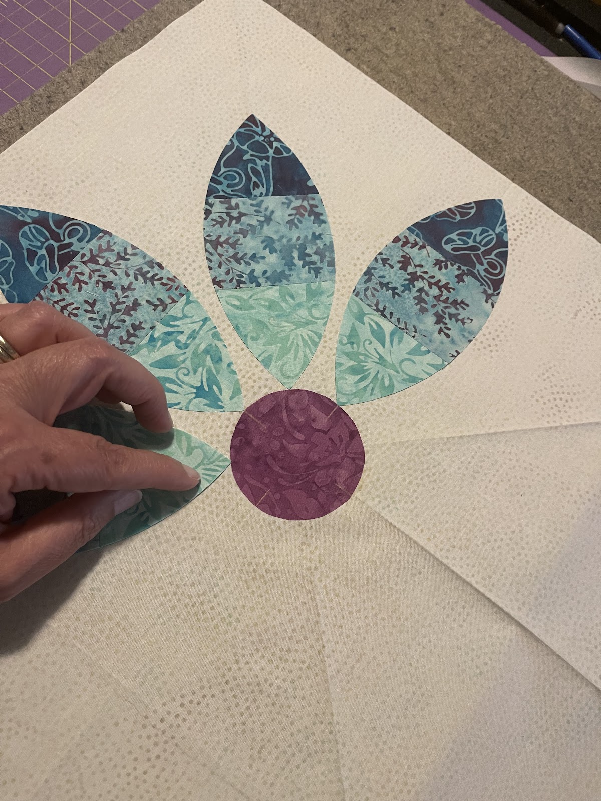 ReplyDeleteI pieced three strips in order of light, medium and dark, before ironing them to the stabilizer. And then cut the petals using Accuquilt and Orange Peel Die, thanks to Emily of Darling Dogwood, who let me borrow hers :-) Removed the paper and ironed the petals in place before completing the stitching close to the edge of the petals.