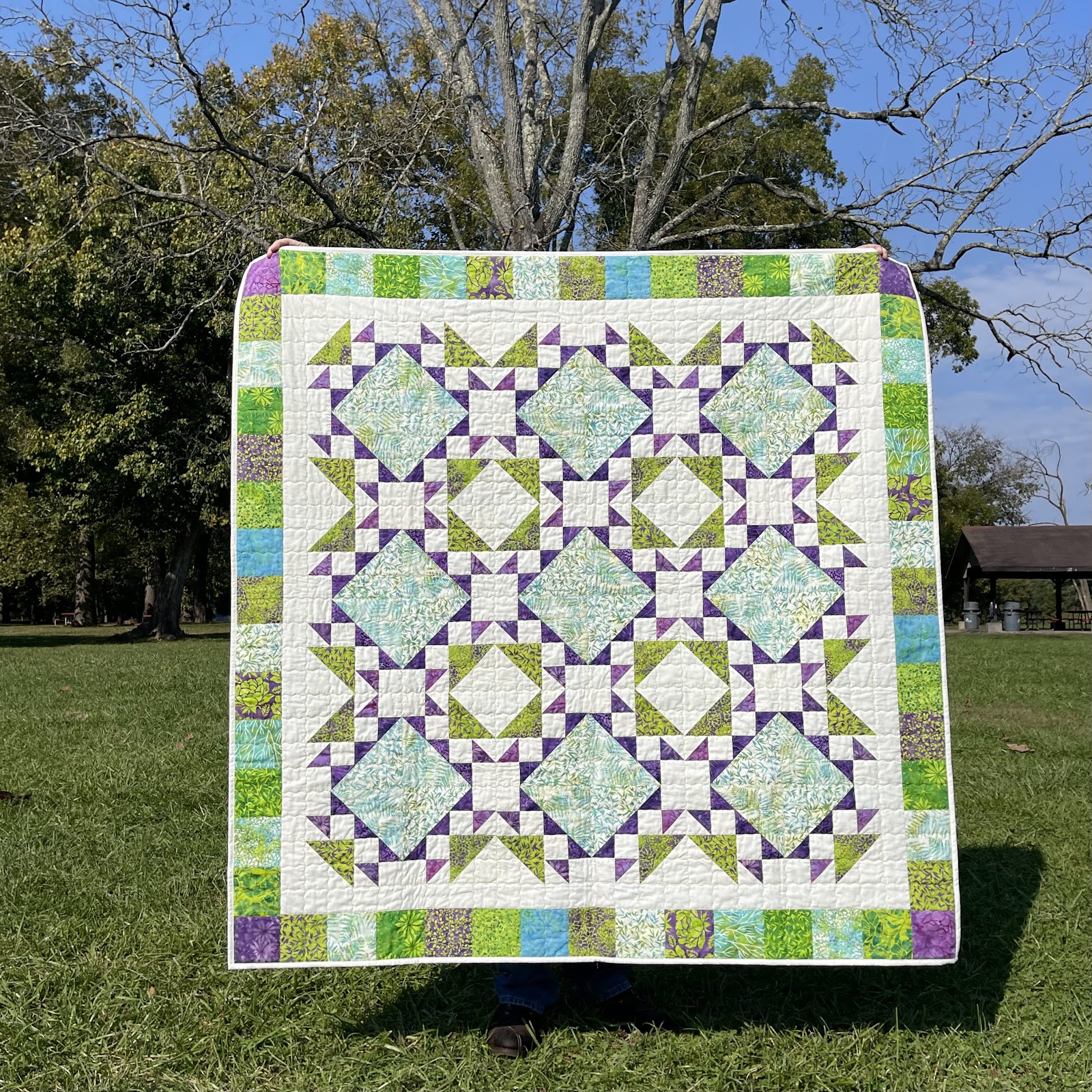 I love patterns with secondary designs. When seemingly simple blocks come together and the secondary pattern emerges it is magical. Do you see the purple stars?